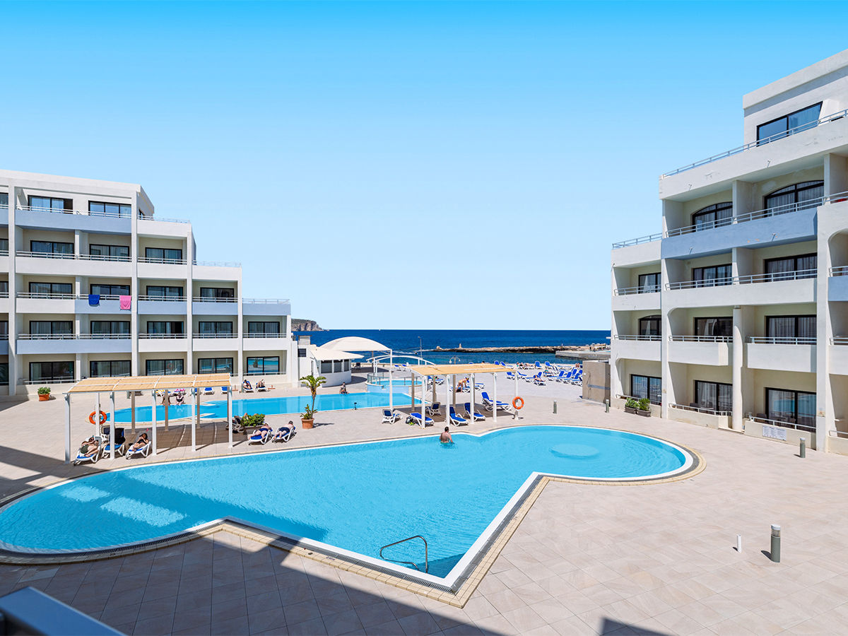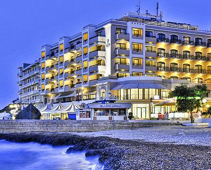 | Hotel se nachází v klidné části turisticky oblíbeného střediska St.Julian´s. Postavením na skalnatém výběžku skýtá nádherný výhled na moře a záliv St.George's. Pláž je vzdálené cca 400 m (skalnatá), nákupní možnosti a zábava jsou v blízkém okolí do 1 km (centrum střediska, obchody, bary a restaurace). Hlavní město Valletta je vzdáleno 8 km, ve vzdálenosti do 15 km pak lze navštívit další zajímavá místa ostrova-Mdina, Temples, aquapark a další. Mezinárodní letiště je vzdáleno 13 km. |