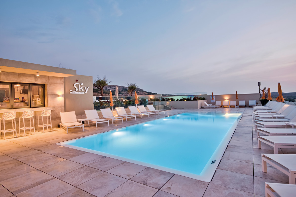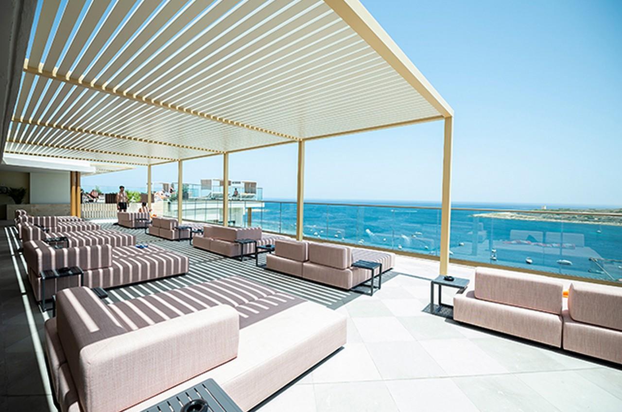 | hotel s programem ,,jen pro dospělé,,(16+) má celkovou kapacitu 180 pokojů rozmístěných na 10 podlažích. Uvítá Vás elegantní vstupní hala s recepcí a výtahy (WiFi ve společných prostorách zdarma). Stravovací služby obstarávají celkem 3 restaurace: snídaňová s nádherným výhledem na záliv, dále tematická řecká a maltská restaurace s vybranými pokrmy dané kuchyně. Příjemné posezení obstarají Sunset bar a Deck bar. Ve vnitřních prostorách je k dispozici konferenční místnost, dále vnitřní bazén a profesionálně vybavené fitness centrum. Nechybí wellness s možností masáží a dalších revitalizačních procedur. Na střeše hotelu Vám bude k dispozici infinity bazén s lehátky a slunečníky a rovněž s možností posezení u pool baru. |